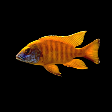 The Sunshine Peacock is a popular African Cichlid native to Lake Malawi. It displays a blue vibrant color on its face and a bright yellow coloration across its body.